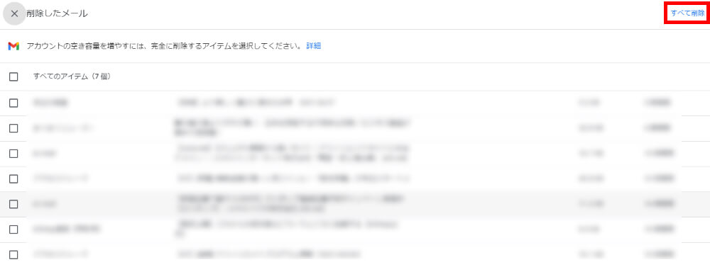 削除したメールが不要であることを確認して、右上の「すべて削除」を選択する。