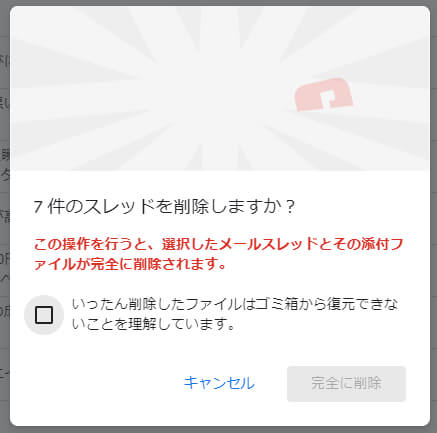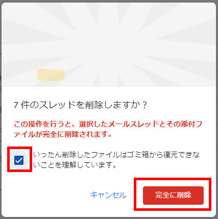 「いったん削除したファイルはゴミ箱から復元できないことを理解しています。」の左のボックスにチェックを入れる。