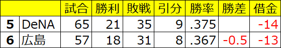 上図のとおり、DeNAの借金(負け越し数)は「-14」で、広島の借金は「-13」だ(ここでは借金をマイナスで表記する)。